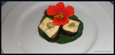 Corte a berinjela em fatias, cozinhe em água com sal. Coloque a berinjela em uma forma, passe molho de tomate em cada fatia e coloque o queijo branco. Leve ao forno por 10 minutos, para dourar o queijo.